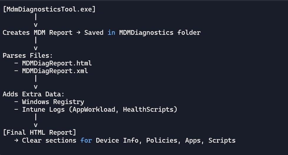 IntuneDebug automates this by parsing MDM diagnostics, registry data, and IME logs into one readable report. Beginners appreciate no Graph API setup or module dependencies—just run a command. Run it locally (no admin needed for basics) or feed it a captured diagnostics zip from remote devices.